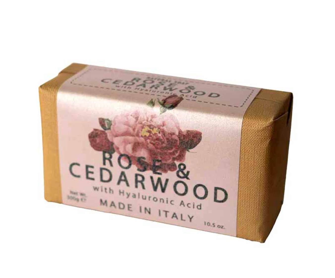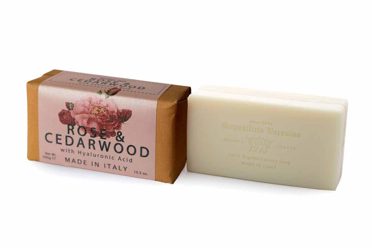 Zeeptablet met de geur van roos en cederhout, verrijkt met hyaluronzuur. Verzeept, vervaardigd en verpakt in de Saponificio Varesino fabriek in Brebbia (Italië), verkregen met uitsluitend natuurlijke producten. Bevat geen conserveringsmiddelen en chelaatvormers van chemische oorsprong. EDTA / BHT VRIJ – Niet getest op dieren.