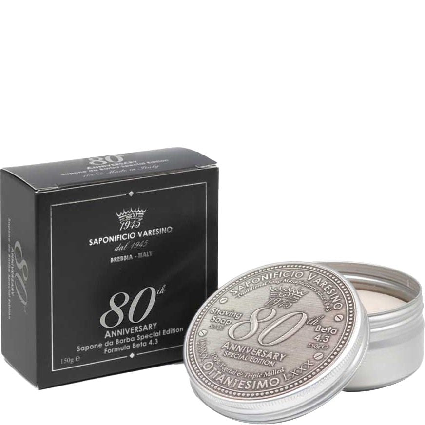 Sapone da Barba 80th Anniversary is een special edition scheerzeep met een Woody Fougère geurkarakter. In deze geur vermengt een citrus cocktail zich met aromatisch groene- en houttonen met mirre en vanille voor een warm-kruidig slotakkoord. 80th Anniversary is geproduceerd ter ere van de 80e verjaardag van Saponificio Varesino. De drievoudig vermalen scheerzeep is geproduceerd volgens de beproefde Beta 4.3 formulering. Deze scheerzeep is verrijkt met *PlantSil™, een revolutionair ingrediënt wat bijdraagt tot een voortreffelijke scheerbeleving.